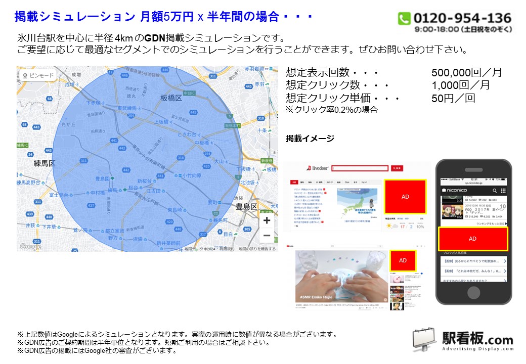 東京メトロ 氷川台駅 を中心に、ご指定の半径(km)を対象に、パソコンやスマートフォンを閲覧している方に向けて配信できるディスプレイ(バナー)広告です。Googleと提携しているサイトやアプリ または Yahoo!JAPANや提携サイトの広告枠に配信できるディスプレイ(バナー広告)で、駅利用者や電車利用者、指定半径内を移動している方や、勤務・居住している方に向けて企業や製品・サービスなどを訴求できます。