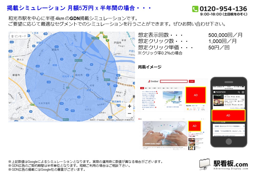 東京メトロ 和光市駅 を中心に、ご指定の半径(km)を対象に、パソコンやスマートフォンを閲覧している方に向けて配信できるディスプレイ(バナー)広告です。Googleと提携しているサイトやアプリ または Yahoo!JAPANや提携サイトの広告枠に配信できるディスプレイ(バナー広告)で、駅利用者や電車利用者、指定半径内を移動している方や、勤務・居住している方に向けて企業や製品・サービスなどを訴求できます。
