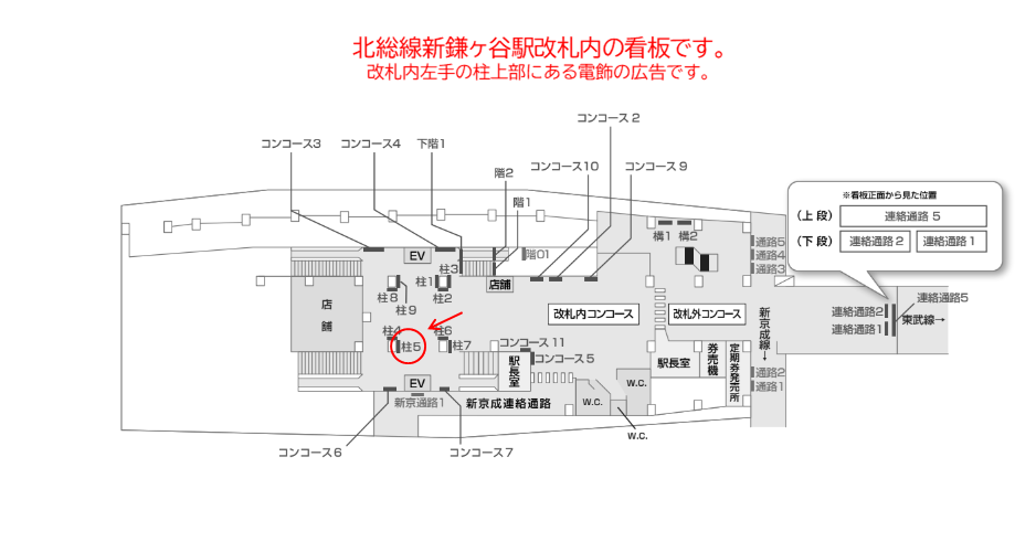 柱№5は、主に上り線へ向かう方の動線上にあり、毎日の利用者へ向けた広告の刷り込み効果が期待できます。