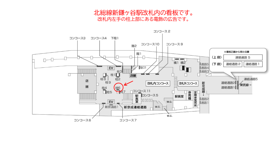 柱№6は、主に上り線へ向かう方の動線上にあり、毎日の利用者へ向けた広告の刷り込み効果が期待できます。