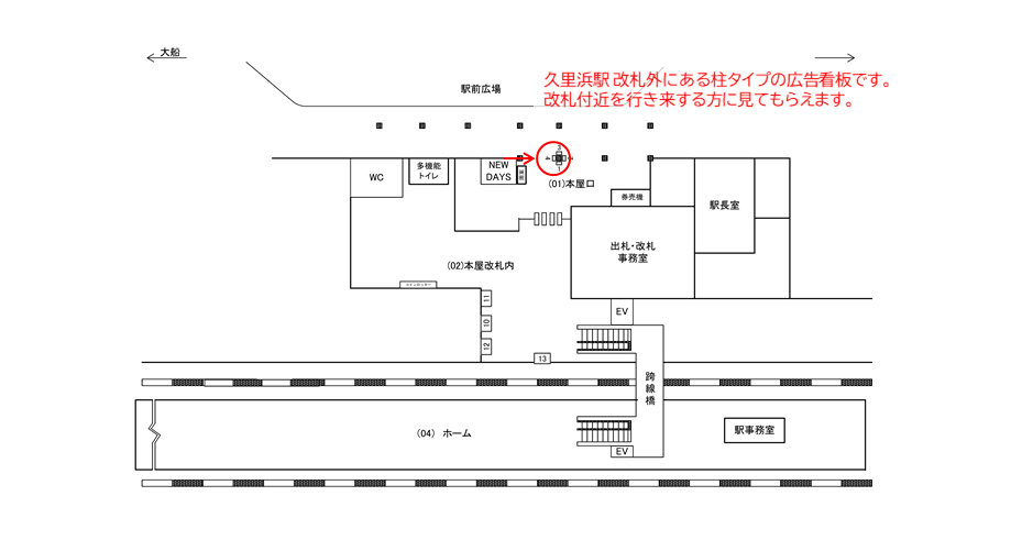 JR久里浜駅の改札そばにある柱タイプの広告看板です。