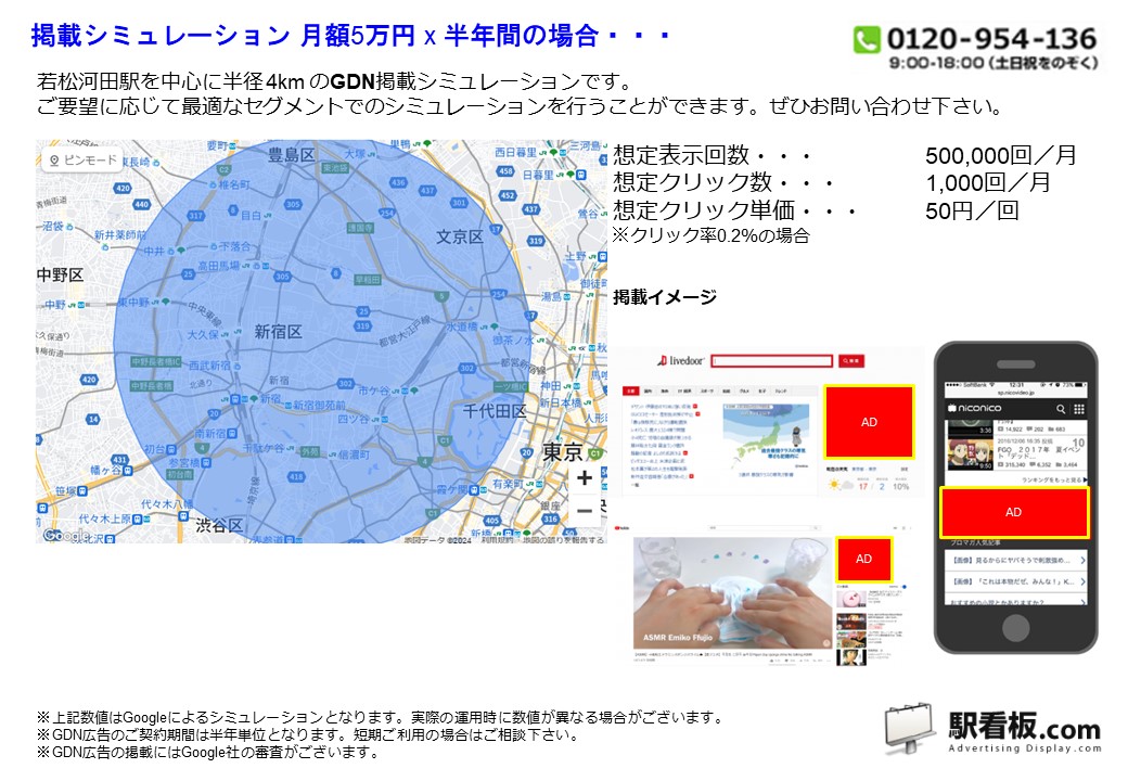 都営 若松河田駅 を中心に、ご指定の半径(km)を対象に、パソコンやスマートフォンを閲覧している方に向けて配信できるディスプレイ(バナー)広告です。Googleと提携しているサイトやアプリ または Yahoo!JAPANや提携サイトの広告枠に配信できるディスプレイ(バナー広告)で、駅利用者や電車利用者、指定半径内を移動している方や、勤務・居住している方に向けて企業や製品・サービスなどを訴求できます。