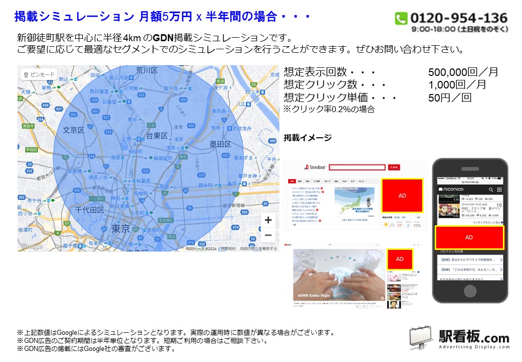 都営 新御徒町駅 を中心に、ご指定の半径(km)を対象に、パソコンやスマートフォンを閲覧している方に向けて配信できるディスプレイ(バナー)広告です。Googleと提携しているサイトやアプリ または Yahoo!JAPANや提携サイトの広告枠に配信できるディスプレイ(バナー広告)で、駅利用者や電車利用者、指定半径内を移動している方や、勤務・居住している方に向けて企業や製品・サービスなどを訴求できます。
