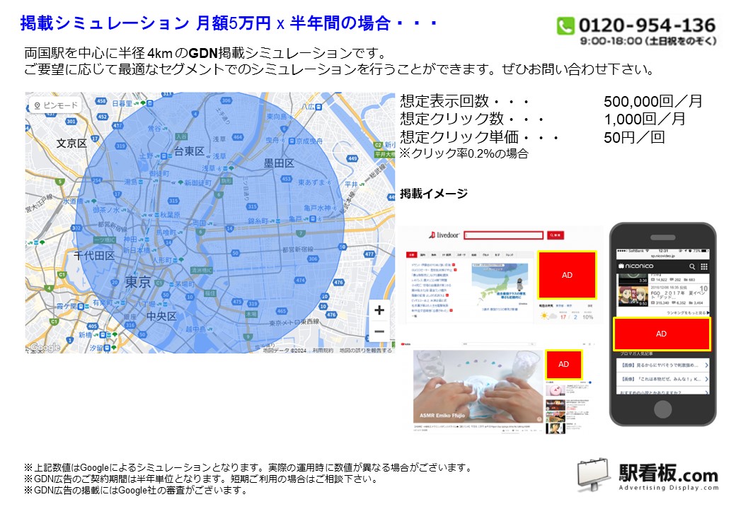 都営 両国駅 を中心に、ご指定の半径(km)を対象に、パソコンやスマートフォンを閲覧している方に向けて配信できるディスプレイ(バナー)広告です。Googleと提携しているサイトやアプリ または Yahoo!JAPANや提携サイトの広告枠に配信できるディスプレイ(バナー広告)で、駅利用者や電車利用者、指定半径内を移動している方や、勤務・居住している方に向けて企業や製品・サービスなどを訴求できます。