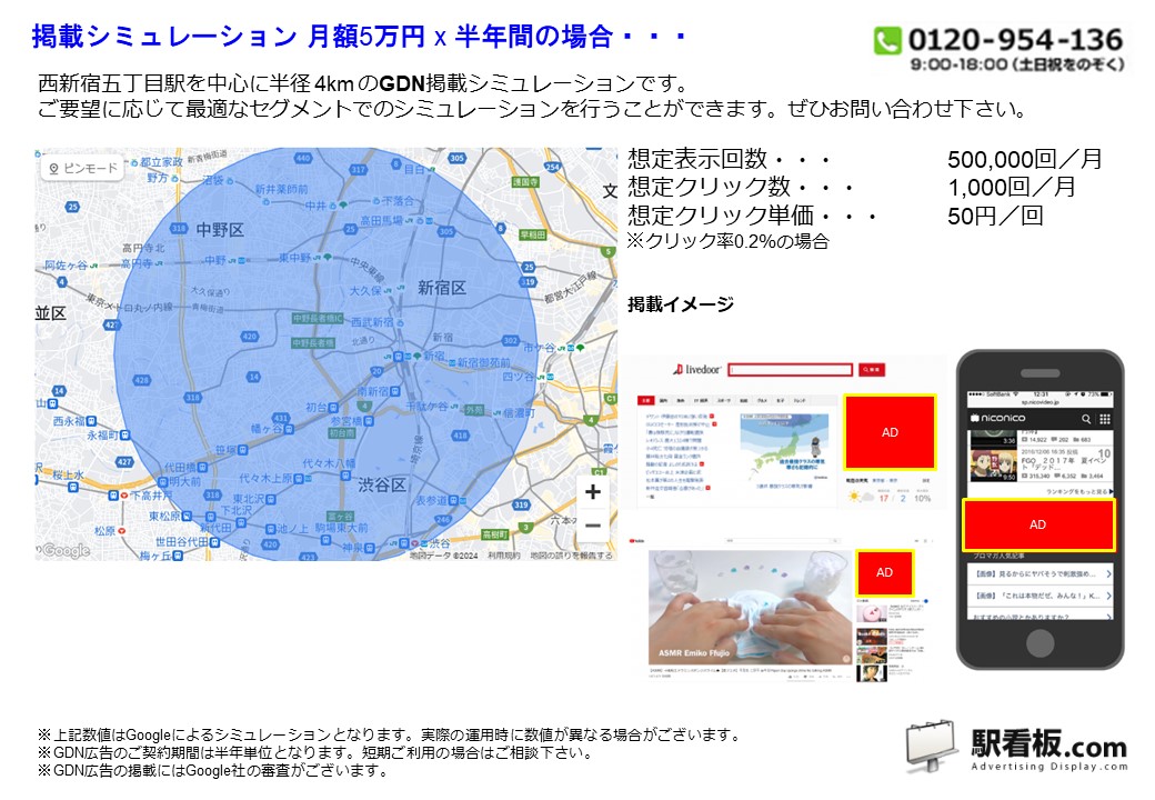 都営 西新宿五丁目駅 を中心に、ご指定の半径(km)を対象に、パソコンやスマートフォンを閲覧している方に向けて配信できるディスプレイ(バナー)広告です。Googleと提携しているサイトやアプリ または Yahoo!JAPANや提携サイトの広告枠に配信できるディスプレイ(バナー広告)で、駅利用者や電車利用者、指定半径内を移動している方や、勤務・居住している方に向けて企業や製品・サービスなどを訴求できます。
