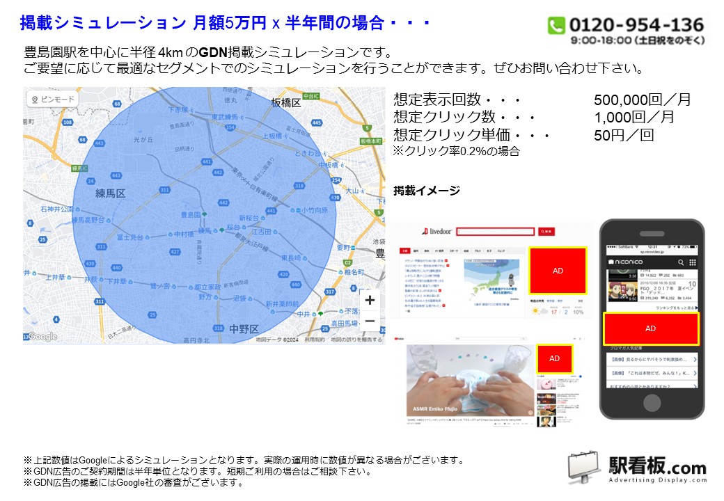 都営 豊島園駅 を中心に、ご指定の半径(km)を対象に、パソコンやスマートフォンを閲覧している方に向けて配信できるディスプレイ(バナー)広告です。Googleと提携しているサイトやアプリ または Yahoo!JAPANや提携サイトの広告枠に配信できるディスプレイ(バナー広告)で、駅利用者や電車利用者、指定半径内を移動している方や、勤務・居住している方に向けて企業や製品・サービスなどを訴求できます。