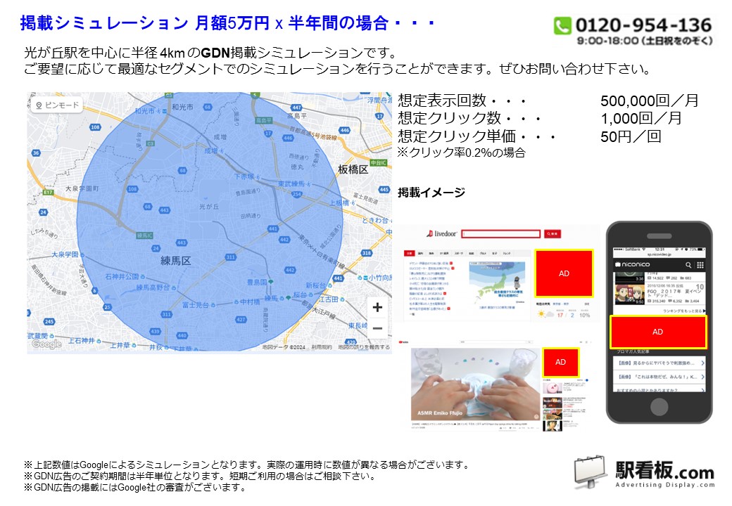 都営 光が丘駅 を中心に、ご指定の半径(km)を対象に、パソコンやスマートフォンを閲覧している方に向けて配信できるディスプレイ(バナー)広告です。Googleと提携しているサイトやアプリ または Yahoo!JAPANや提携サイトの広告枠に配信できるディスプレイ(バナー広告)で、駅利用者や電車利用者、指定半径内を移動している方や、勤務・居住している方に向けて企業や製品・サービスなどを訴求できます。