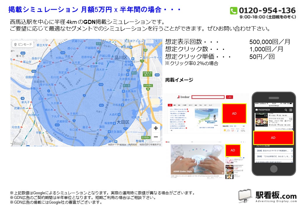 都営 西馬込駅 を中心に、ご指定の半径(km)を対象に、パソコンやスマートフォンを閲覧している方に向けて配信できるディスプレイ(バナー)広告です。Googleと提携しているサイトやアプリ または Yahoo!JAPANや提携サイトの広告枠に配信できるディスプレイ(バナー広告)で、駅利用者や電車利用者、指定半径内を移動している方や、勤務・居住している方に向けて企業や製品・サービスなどを訴求できます。