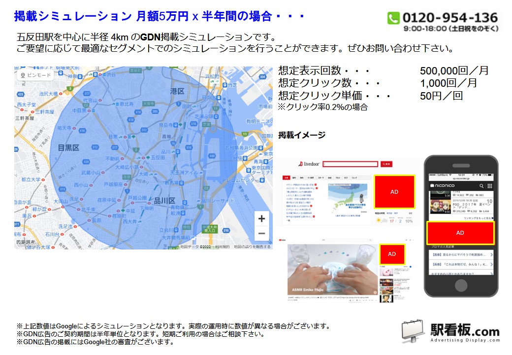 都営 五反田駅 を中心に、ご指定の半径(km)を対象に、パソコンやスマートフォンを閲覧している方に向けて配信できるディスプレイ(バナー)広告です。Googleと提携しているサイトやアプリ または Yahoo!JAPANや提携サイトの広告枠に配信できるディスプレイ(バナー広告)で、駅利用者や電車利用者、指定半径内を移動している方や、勤務・居住している方に向けて企業や製品・サービスなどを訴求できます。
