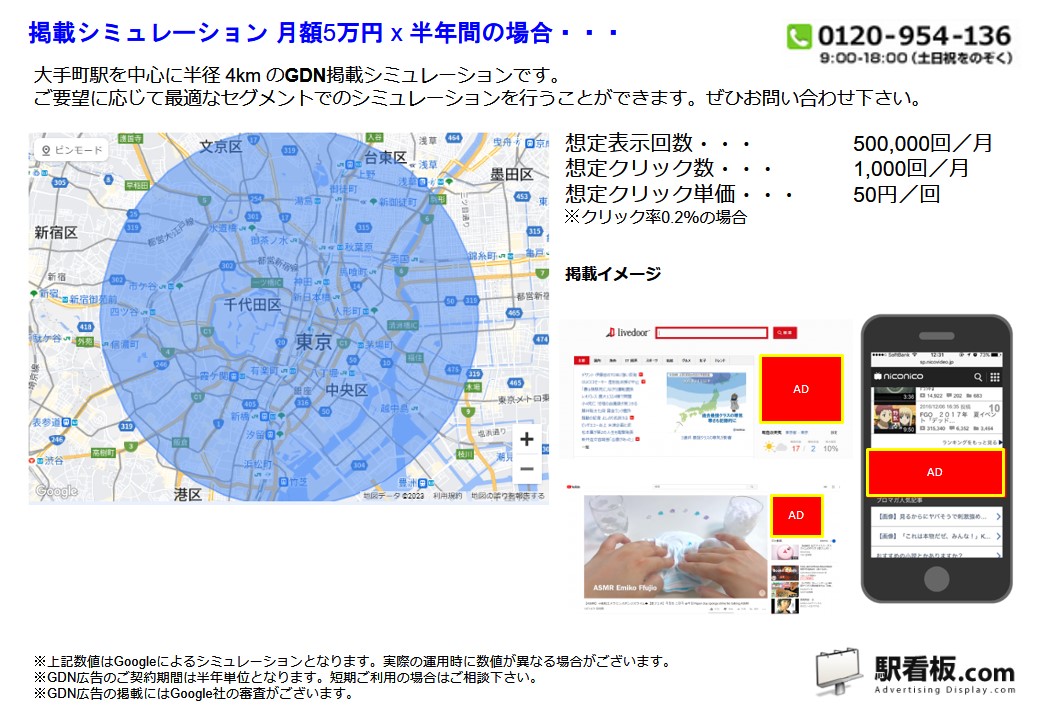 都営 大手町駅 を中心に、ご指定の半径(km)を対象に、パソコンやスマートフォンを閲覧している方に向けて配信できるディスプレイ(バナー)広告です。Googleと提携しているサイトやアプリ または Yahoo!JAPANや提携サイトの広告枠に配信できるディスプレイ(バナー広告)で、駅利用者や電車利用者、指定半径内を移動している方や、勤務・居住している方に向けて企業や製品・サービスなどを訴求できます。