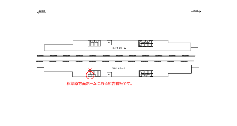 つくばエクスプレス線の上りホームに設置された広告看板です。この広告看板は秋葉原・北千住・流山おおたかの森・守谷方面へ向かう方が乗車するホームにあります