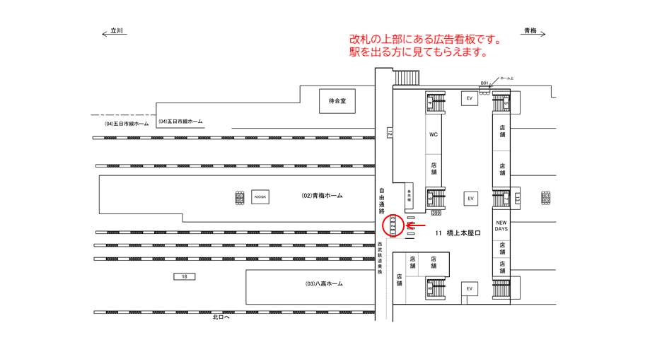 改札上部に設置された電飾タイプの広告看板です。改札を出る際に視界に入る位置にあります。拝島駅は青梅線と五日市線の接続駅で、西武線へのお乗り換えも行なえる駅です。拝島駅を基点とした各沿線へ向けた広告案内にご利用頂けます。