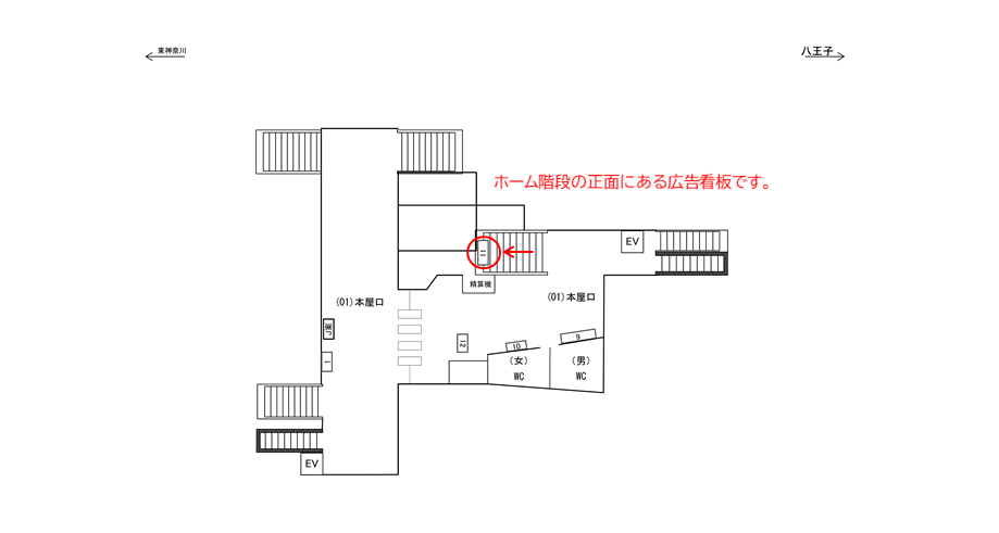 ホームに下りる際の階段正面部分にあります。階段を使う方の視界に入ります。