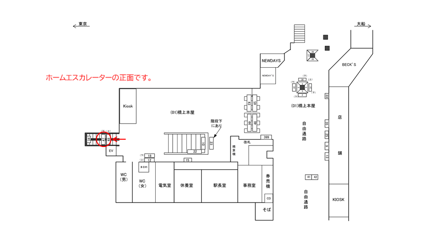東海道線ホームに下りるエスカレーターの正面にあります。視界に入りやすい高さにあり、東戸塚駅の中でも自信をもってオススメできる広告商品です。