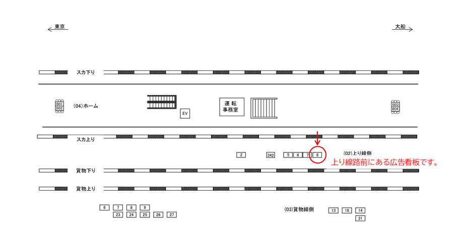 線路前(横浜・品川・東京・千葉方面)に設置された広告看板です。奥ではなく手前にある建植タイプの内容式看板です。乗車をお待ちの方にご覧いただける看板で、待ち時間を利用したご案内にご利用ください。