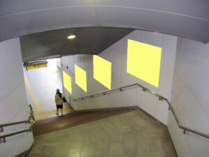 ゆりかもめ 東京ビッグサイト駅「集中貼り」は、駅構内の階段やエスカレーター横の壁面などにポスターを掲載する広告商品です。