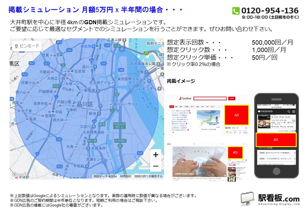 東急 大井町駅を中心に、ご指定の半径(km)を対象に、パソコンやスマートフォンを閲覧している方に向けて配信できるディスプレイ(バナー)広告です。Googleと提携しているサイトやアプリ または Yahoo!JAPANや提携サイトの広告枠に配信できるディスプレイ(バナー広告)で、駅利用者や電車利用者、指定半径内を移動している方や、勤務・居住している方に向けて企業や製品・サービスなどを訴求できます。