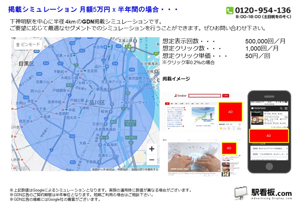 東急 下神明駅を中心に、ご指定の半径(km)を対象に、パソコンやスマートフォンを閲覧している方に向けて配信できるディスプレイ(バナー)広告です。Googleと提携しているサイトやアプリ または Yahoo!JAPANや提携サイトの広告枠に配信できるディスプレイ(バナー広告)で、駅利用者や電車利用者、指定半径内を移動している方や、勤務・居住している方に向けて企業や製品・サービスなどを訴求できます。