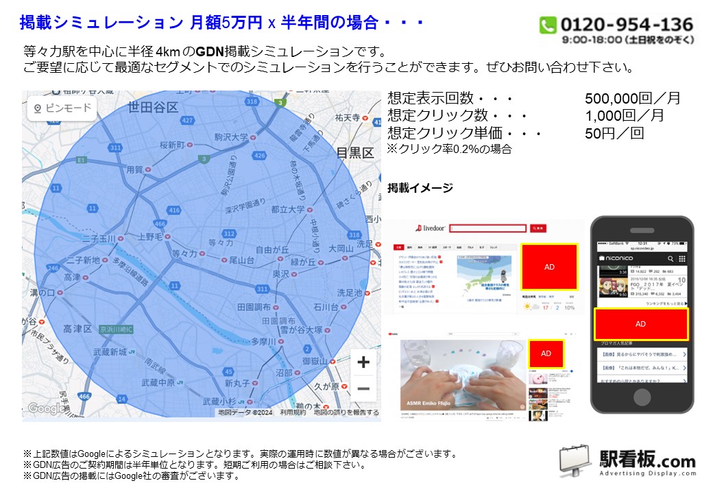東急 等々力駅を中心に、ご指定の半径(km)を対象に、パソコンやスマートフォンを閲覧している方に向けて配信できるディスプレイ(バナー)広告です。Googleと提携しているサイトやアプリ または Yahoo!JAPANや提携サイトの広告枠に配信できるディスプレイ(バナー広告)で、駅利用者や電車利用者、指定半径内を移動している方や、勤務・居住している方に向けて企業や製品・サービスなどを訴求できます。