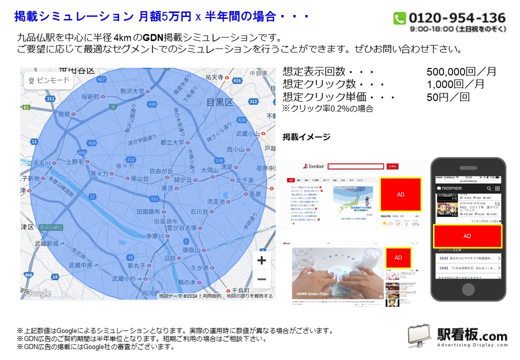 東急 九品仏駅を中心に、ご指定の半径(km)を対象に、パソコンやスマートフォンを閲覧している方に向けて配信できるディスプレイ(バナー)広告です。Googleと提携しているサイトやアプリ または Yahoo!JAPANや提携サイトの広告枠に配信できるディスプレイ(バナー広告)で、駅利用者や電車利用者、指定半径内を移動している方や、勤務・居住している方に向けて企業や製品・サービスなどを訴求できます。