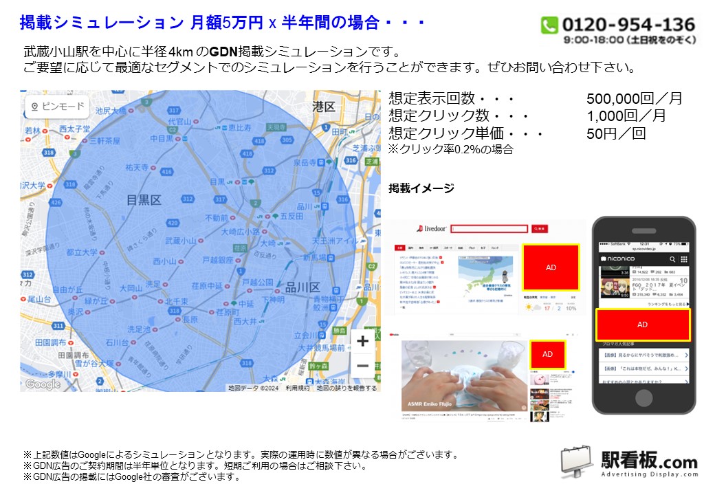 東急 武蔵小山駅を中心に、ご指定の半径(km)を対象に、パソコンやスマートフォンを閲覧している方に向けて配信できるディスプレイ(バナー)広告です。Googleと提携しているサイトやアプリ または Yahoo!JAPANや提携サイトの広告枠に配信できるディスプレイ(バナー広告)で、駅利用者や電車利用者、指定半径内を移動している方や、勤務・居住している方に向けて企業や製品・サービスなどを訴求できます。