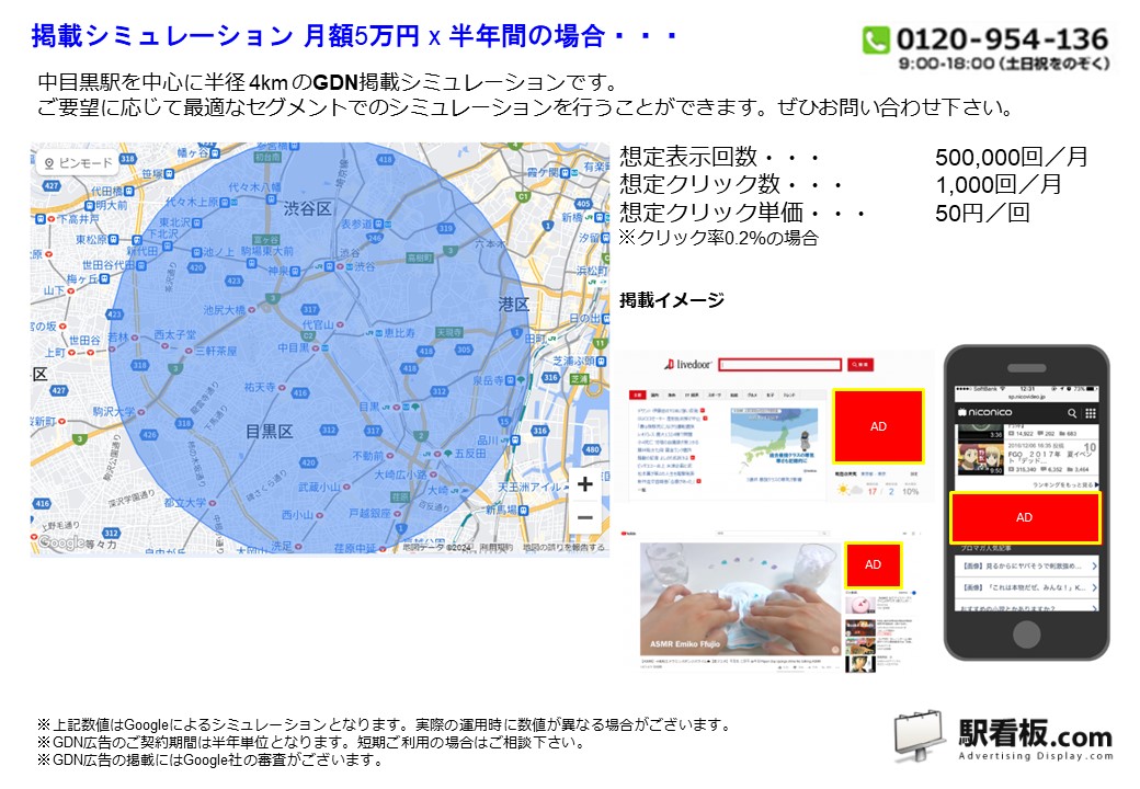 東急 中目黒駅を中心に、ご指定の半径(km)を対象に、パソコンやスマートフォンを閲覧している方に向けて配信できるディスプレイ(バナー)広告です。Googleと提携しているサイトやアプリ または Yahoo!JAPANや提携サイトの広告枠に配信できるディスプレイ(バナー広告)で、駅利用者や電車利用者、指定半径内を移動している方や、勤務・居住している方に向けて企業や製品・サービスなどを訴求できます。