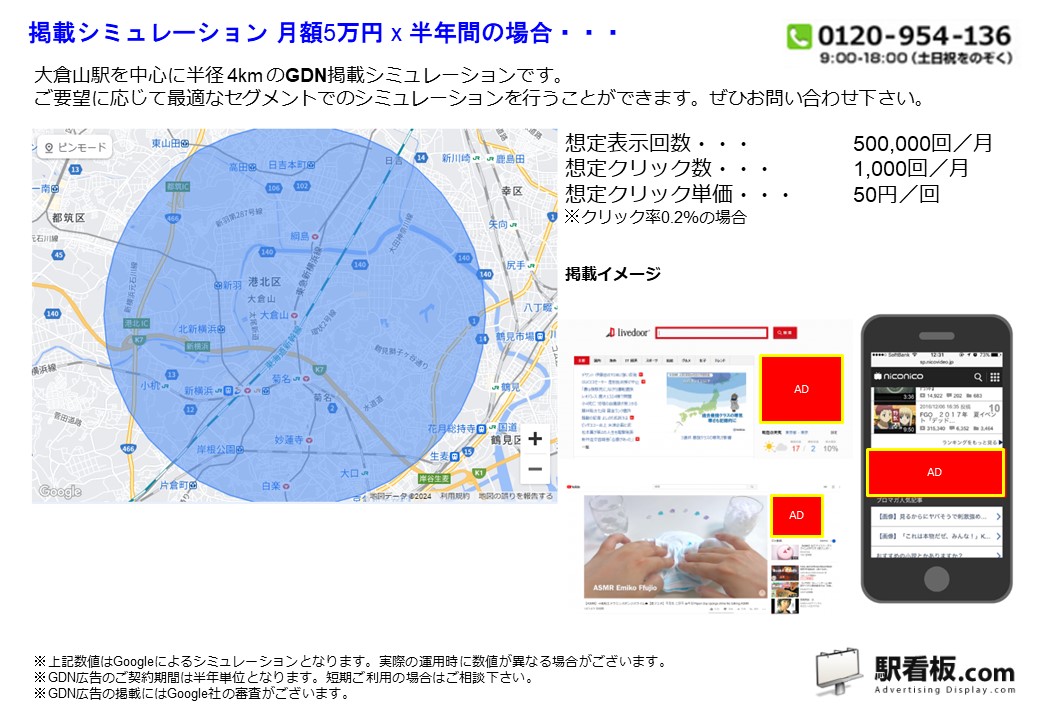 東急 大倉山駅を中心に、ご指定の半径(km)を対象に、パソコンやスマートフォンを閲覧している方に向けて配信できるディスプレイ(バナー)広告です。Googleと提携しているサイトやアプリ または Yahoo!JAPANや提携サイトの広告枠に配信できるディスプレイ(バナー広告)で、駅利用者や電車利用者、指定半径内を移動している方や、勤務・居住している方に向けて企業や製品・サービスなどを訴求できます。