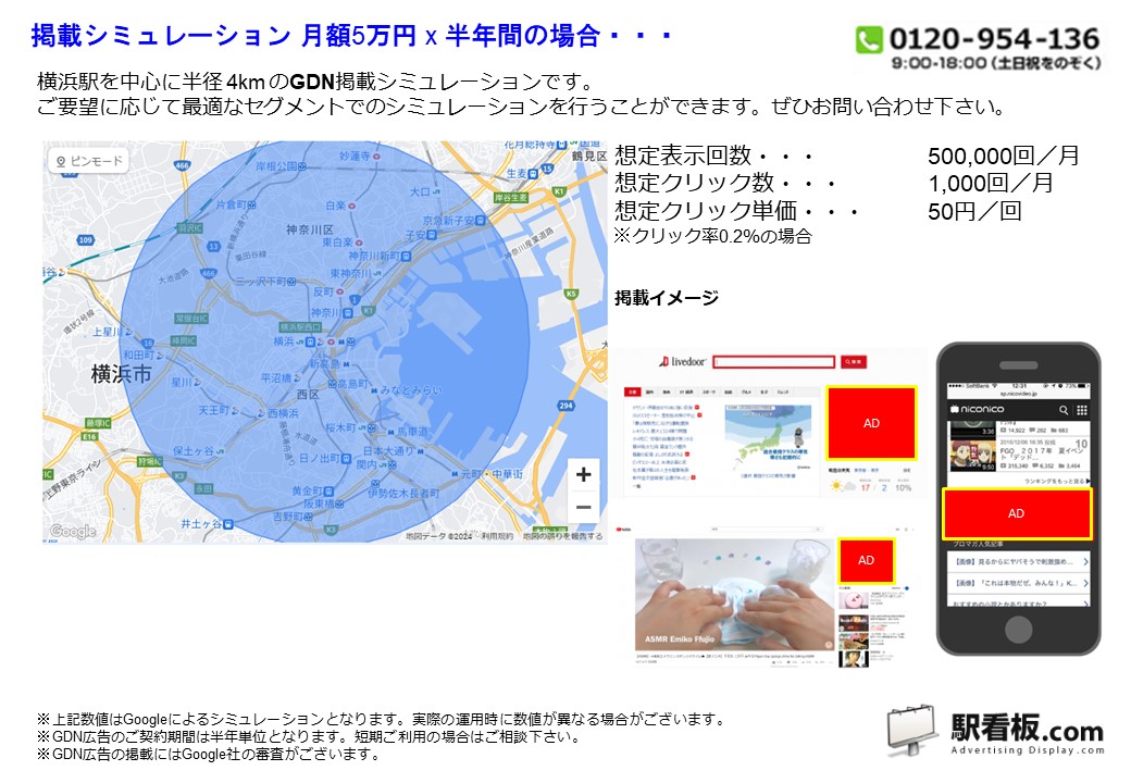 東急 横浜駅を中心に、ご指定の半径(km)を対象に、パソコンやスマートフォンを閲覧している方に向けて配信できるディスプレイ(バナー)広告です。Googleと提携しているサイトやアプリ または Yahoo!JAPANや提携サイトの広告枠に配信できるディスプレイ(バナー広告)で、駅利用者や電車利用者、指定半径内を移動している方や、勤務・居住している方に向けて企業や製品・サービスなどを訴求できます。