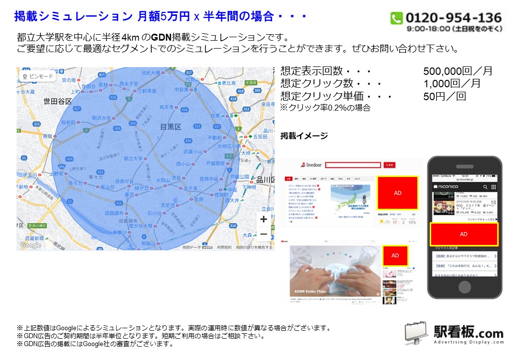 東急 都立大学駅を中心に、ご指定の半径(km)を対象に、パソコンやスマートフォンを閲覧している方に向けて配信できるディスプレイ(バナー)広告です。Googleと提携しているサイトやアプリ または Yahoo!JAPANや提携サイトの広告枠に配信できるディスプレイ(バナー広告)で、駅利用者や電車利用者、指定半径内を移動している方や、勤務・居住している方に向けて企業や製品・サービスなどを訴求できます。