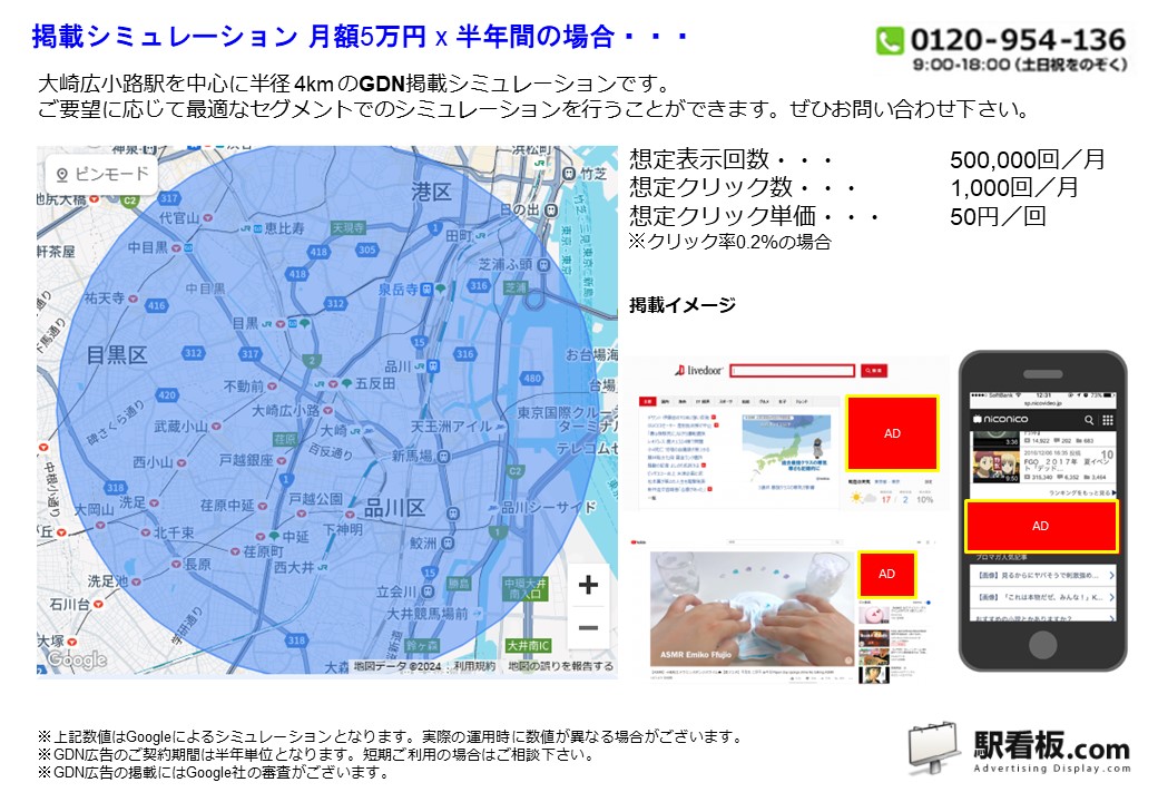 東急 大崎広小路駅を中心に、ご指定の半径(km)を対象に、パソコンやスマートフォンを閲覧している方に向けて配信できるディスプレイ(バナー)広告です。Googleと提携しているサイトやアプリ または Yahoo!JAPANや提携サイトの広告枠に配信できるディスプレイ(バナー広告)で、駅利用者や電車利用者、指定半径内を移動している方や、勤務・居住している方に向けて企業や製品・サービスなどを訴求できます。