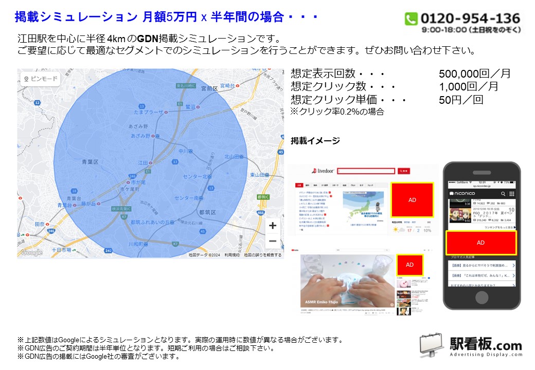 東急 江田駅を中心に、ご指定の半径(km)を対象に、パソコンやスマートフォンを閲覧している方に向けて配信できるディスプレイ(バナー)広告です。Googleと提携しているサイトやアプリ または Yahoo!JAPANや提携サイトの広告枠に配信できるディスプレイ(バナー広告)で、駅利用者や電車利用者、指定半径内を移動している方や、勤務・居住している方に向けて企業や製品・サービスなどを訴求できます。
