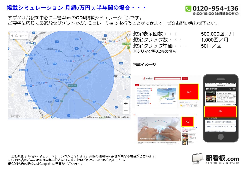 東急 すずかけ台駅を中心に、ご指定の半径(km)を対象に、パソコンやスマートフォンを閲覧している方に向けて配信できるディスプレイ(バナー)広告です。Googleと提携しているサイトやアプリ または Yahoo!JAPANや提携サイトの広告枠に配信できるディスプレイ(バナー広告)で、駅利用者や電車利用者、指定半径内を移動している方や、勤務・居住している方に向けて企業や製品・サービスなどを訴求できます。
