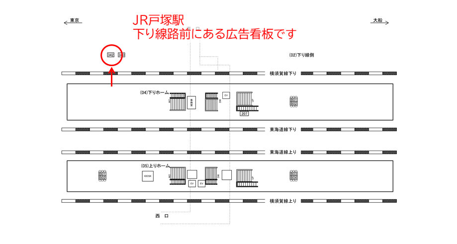 この大型広告看板「下り線側№342」を活用し、戸塚駅を日常的に利用する人々に向けて、長期間にわたり商品やサービスをしっかりと伝えることができます。通勤・通学で繰り返し同じ広告を見ることで、認知度が高まり、購買やサービス利用のきっかけにもなります。地元密着のビジネスはもちろん、広域エリアを対象としたブランド広告にも適した広告です。