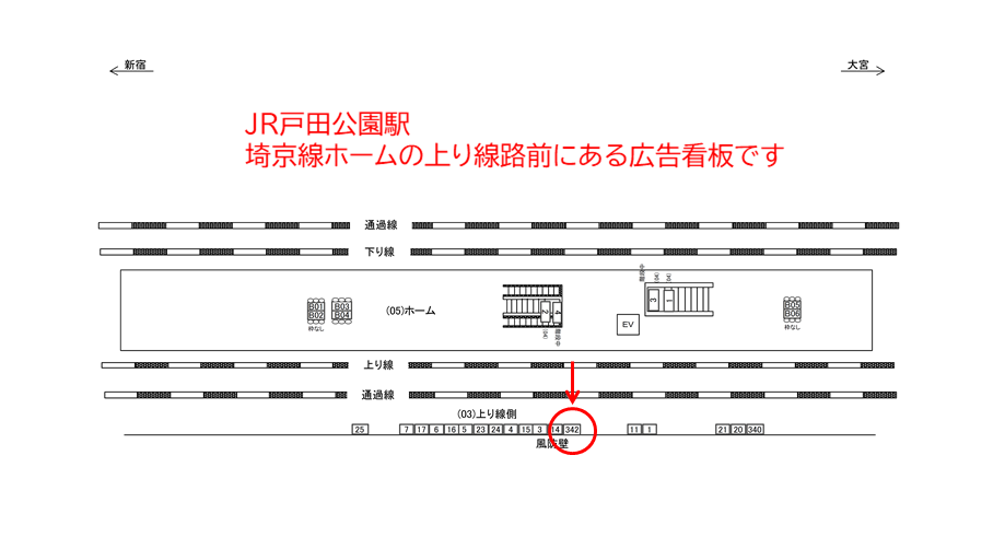 埼京線の上り線路前(池袋・新宿・大崎・りんかい線方面)に設置された広告看板です。東京都内方面への電車を待つ方に正対する位置にございます。ホーム看板の中で最大級の大きさです。