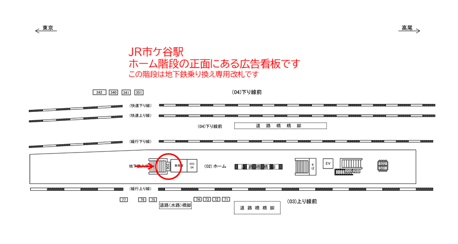市ヶ谷駅を経由駅として乗り換え利用される方、市ヶ谷駅から電車に乗車される方、を対象とした広告です。