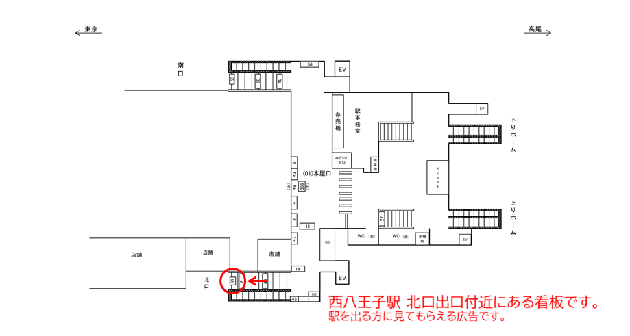 JR西八王子駅の北口付近に設置された広告看板です。階段の正面にあり、駅利用者の目に留まりやすい効果的な広告スペースです。通勤・通学者や地域住民が多く利用する出入口であり、視認性が高いのが特徴です。