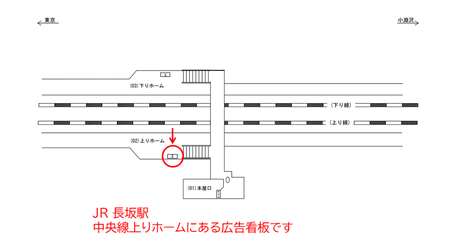 中央線下りホームにある長期掲載向きの広告看板です。電車待つ方を対象とした広告で、日常的に駅を利用する学生や通勤利用者に宣伝します。