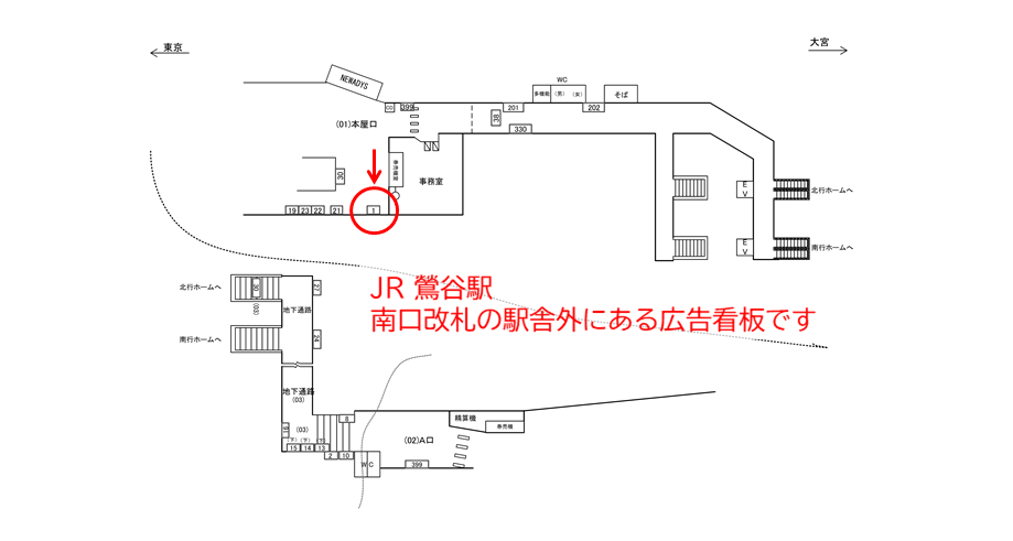 鶯谷駅の南口改札の外にある建植タイプの広告看板です。南口利用者を対象とした広告看板です。駅周辺を行き来する方に店舗への道案内にご利用ください。