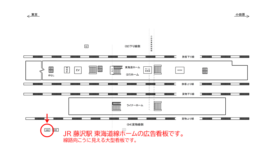 東海道線の一般ホームから上り線路向こうに見える場所にあります。藤沢駅から上り電車を待つ方を対象とした広告です。離れた位置にありますがサイズの大きな広告は良く見えます。企業広告にオススメです。
