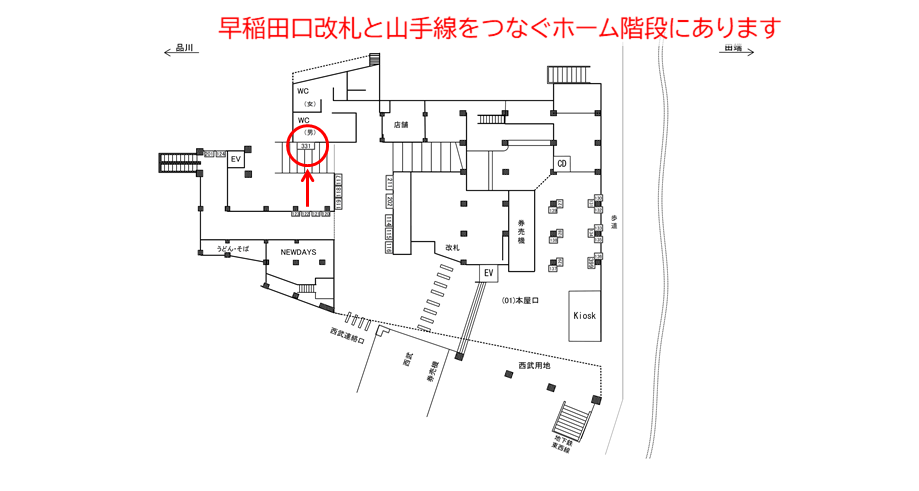 ○ホーム№7 ホーム上(JR山手線ホーム 階段正面 早稲田口改札側) |