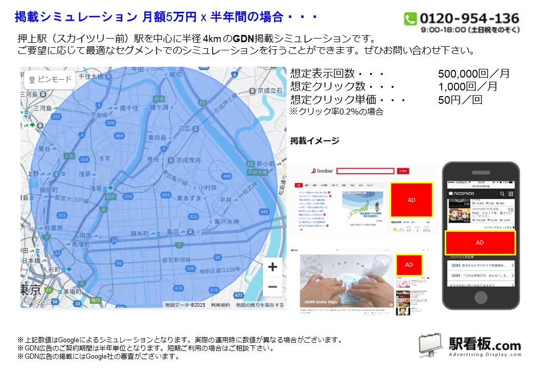 東武 押上駅(スカイツリー前) を中心に、ご指定の半径(km)を対象に、パソコンやスマートフォンを閲覧している方に向けて配信できるディスプレイ(バナー)広告です。Googleと提携しているサイトやアプリ または Yahoo!JAPANや提携サイトの広告枠に配信できるディスプレイ(バナー広告)で、駅利用者や電車利用者、指定半径内を移動している方や、勤務・居住している方に向けて企業や製品・サービスなどを訴求できます。