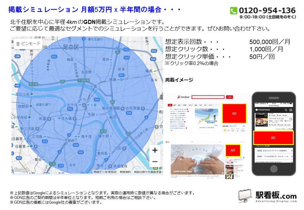 東武 北千住駅 を中心に、ご指定の半径(km)を対象に、パソコンやスマートフォンを閲覧している方に向けて配信できるディスプレイ(バナー)広告です。Googleと提携しているサイトやアプリ または Yahoo!JAPANや提携サイトの広告枠に配信できるディスプレイ(バナー広告)で、駅利用者や電車利用者、指定半径内を移動している方や、勤務・居住している方に向けて企業や製品・サービスなどを訴求できます。