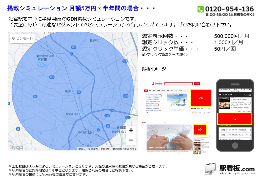 東武 姫宮駅 を中心に、ご指定の半径(km)を対象に、パソコンやスマートフォンを閲覧している方に向けて配信できるディスプレイ(バナー)広告です。Googleと提携しているサイトやアプリ または Yahoo!JAPANや提携サイトの広告枠に配信できるディスプレイ(バナー広告)で、駅利用者や電車利用者、指定半径内を移動している方や、勤務・居住している方に向けて企業や製品・サービスなどを訴求できます。