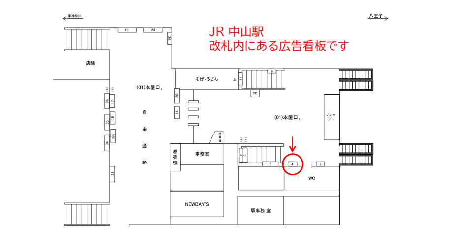 JR横浜線、中山駅の構内にある電飾看板です。横浜線と改札を行き来する導線上にあります。日常的に中山駅を利用するビジネスパーソンや学生を対象とした広告にオススメです。