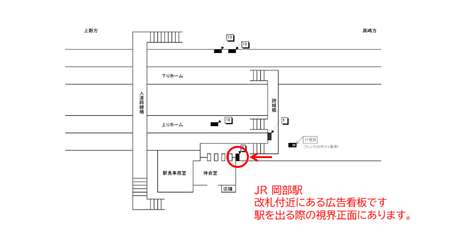 JR高崎線 岡部駅、改札そばにある広告看板です。改札へ向かう導線上の正面に位置していて、岡部駅を出る方を対象とした広告です。岡部駅の周辺にある店舗の案内でしたり、通勤者や学生ターゲットのお客様に有効です。