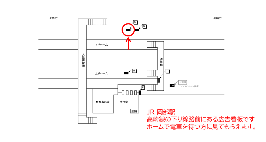 JR高崎線 岡部駅、下り線路の前にある建植タイプの広告看板です。ワイド360cmの大きな看板で、高崎線ホームで電車を待つ方に宣伝します。