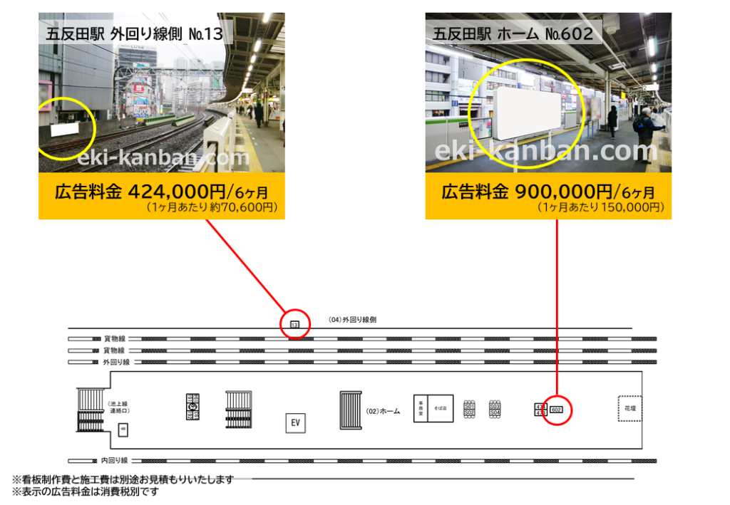 五反田駅の山手線ホームの線路向こうとホーム上にある広告看板です。こちら以外の広告についてはスタッフまでお問い合わせください。