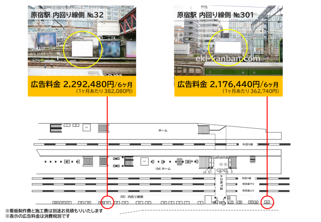JR原宿駅、ホームの駅広告(駅臨時広告)設備のご紹介です。 JR原宿駅「ホームドアシート 山手線」は、ホームドアにてシート広告を掲載できる商品です。 ホームにて、電車待ちの方々にご覧頂けます。 JR原宿駅を利用される方へ向けた企業広告や店舗施設紹介、サービス商品周知に適したロケーションです。日々JR原宿駅を利用される方を対象とした広告にご活用ください。 こちらのホームシート広告は短期的に話題性の高い駅広告実施を検討中の方にお勧めいたします。 ※記載の広告料金は、内回りまたは外回りのいずれかに広告掲載した場合の金額です。 ※料金改定や運用の見直しなどにより料金や仕様が変更となる場合がございます。詳細はお問い合わせください。 ※JR原宿駅「ホームドアシート 山手線」の利用状況については駅看板.comスタッフまでお問い合わせください。