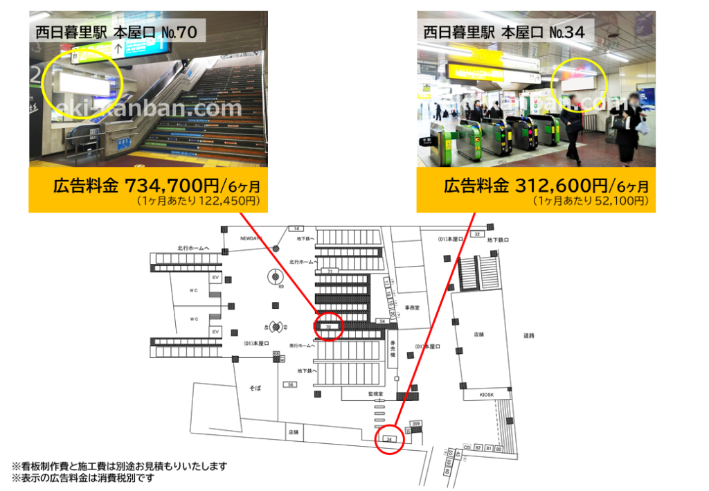 ■ 駅広告の料金 駅看板「JR 西日暮里駅 本屋口№81」 広告料金:478,500円/6ヶ月 税別 ※ 看板制作と取付工事にかかる費用は別途お見積りいたします ※ 広告料金は過去の販売価格を参照しています ※ 広告看板の利用状況と詳細は電話もしくはフォームよりお問い合わせください ■ 広告ロケーション 西日暮里駅の改札の外通路にある広告看板です。出口に近いロケーションで、近隣の施設や店舗への認知および案内に適した広告です。西日暮里を日常的に利用する方への宣伝におすすめです。 ■ お問い合わせお待ちしています! 西日暮里駅で広告をお探しのお客様へ この看板以外にも広告看板設備がございます。 資料請求は駅看板.comスタッフにお声くだされば広告資料をご用意します。資料には広告の場所、看板の現地写真、初回にかかる看板制作と取付工事の費用も分かりやすくおまとめします。広告のご相談や資料請求は無料ですので皆様のご連絡をお待ちしています。