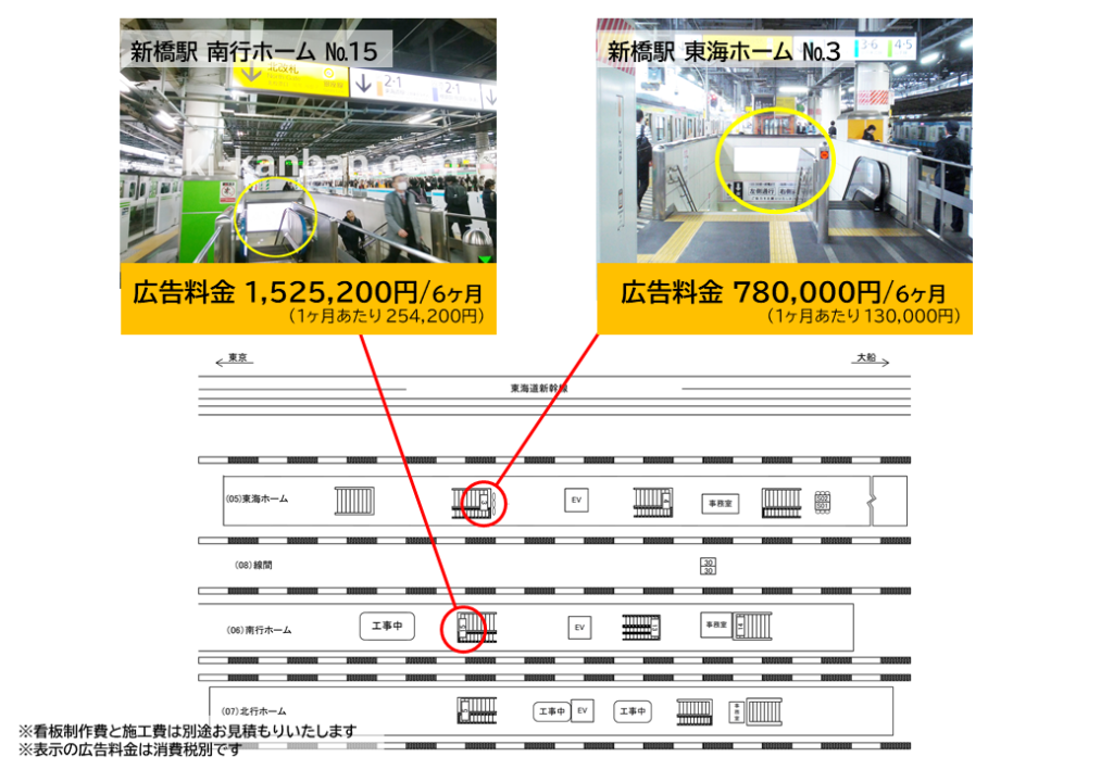 新橋駅の山手線ホーム・京浜東北線ホーム・東海道線ホームにある駅広告です。